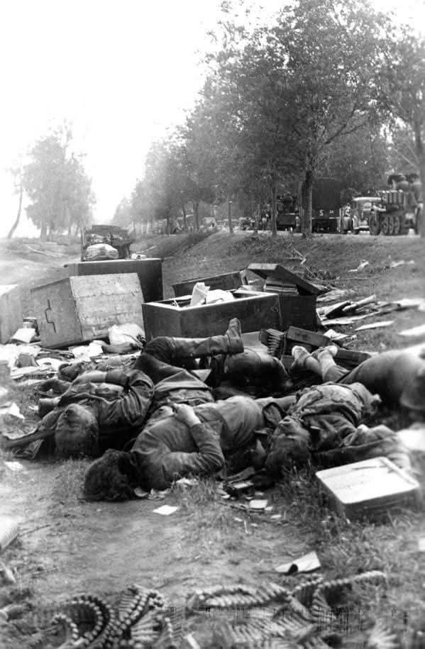 На фото: Погибшие красноармейцы, а также мирные жители — женщины и дети. Тела свалены в придорожный кювет, словно бытовой мусор; мимо по дороге спокойно движутся колонны немецких войск.