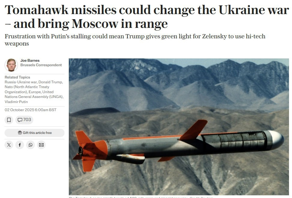 Помимо этого, для запуска таких ракет Украине потребуется использовать предоставленные США разведданные. Это фактически даёт США право вето на любой удар.Возможные поставки Украине ракет Tomahawk могут занять месяцы — Telegraph ▪️Быстро передать эти ракеты ВСУ невозможно. ▪️Также Вашингтон может отправить Киеву эти ракеты без разрешения на их использование с целью "повлиять на Москву в вопросе переговоров". ➖"Tomahawk — дорогостоящая ракета, реальная проблема с точки зрения материалов заключается не в цене, а в производстве. США производят от 50 до 70 таких ракет в год и уже потратили сотни на Ближнем Востоке. Расстаться с достаточным количеством крылатых ракет, чтобы оказать значимое воздействие, будет сложно" — пишут западные аналитики. ▪️Помимо этого, для запуска таких ракет Украине потребуется использовать предоставленные США разведданные. Это фактически даёт США право вето на любой удар.0 Комментарии ·0 Поделились ·111 Просмотры ·0 Оценка -