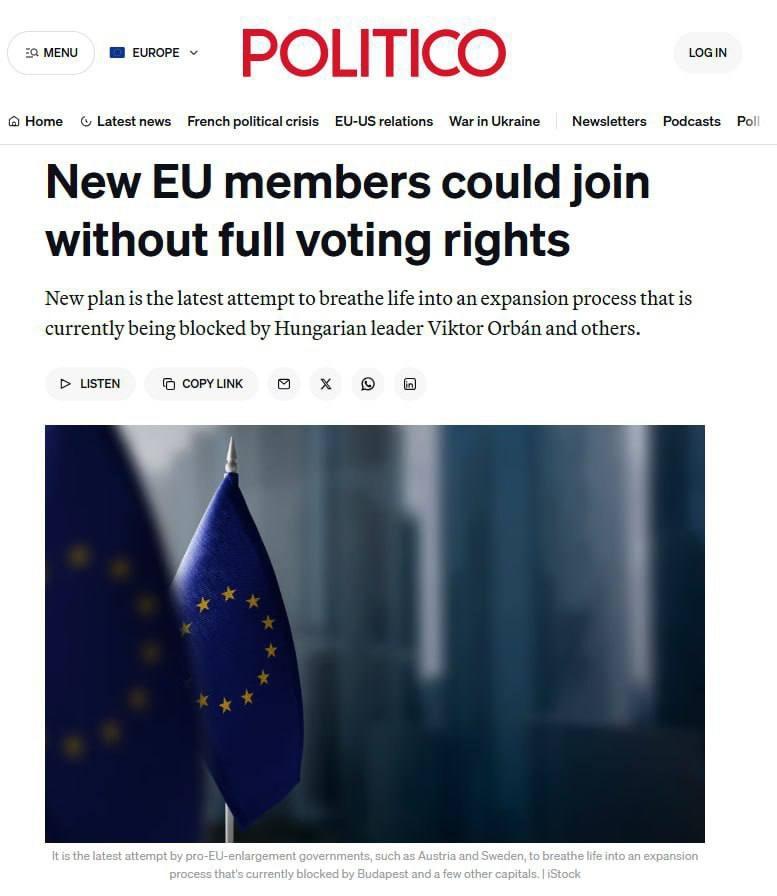 Предложение на ранней стадии разработки и должно быть одобрено всеми 27 членами ЕС.Украину хотят принять в ЕС без полноценного права голоса — Politico Согласно новому механизму, у новых членов ЕС какое-то время не будет полноценного права голоса, в частности, они не смогут накладывать вето на решения блока. Подразумевается, что такой принцип вступления в союз поможет сделать некоторых лидеров, например Виктора Орбана, более сговорчивыми. Предложение на ранней стадии разработки и должно быть одобрено всеми 27 членами ЕС.· 0 Комментарии ·0 Поделились ·581 Просмотры ·0 Оценка1